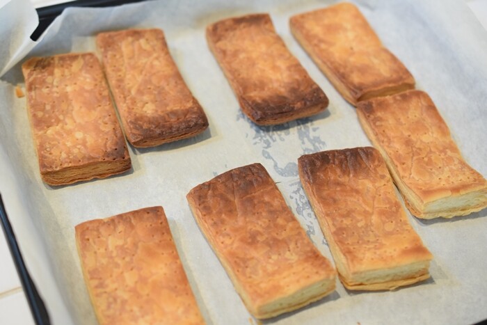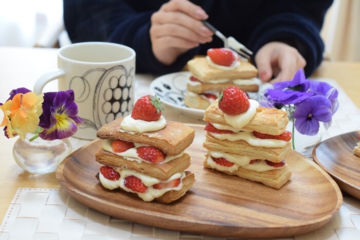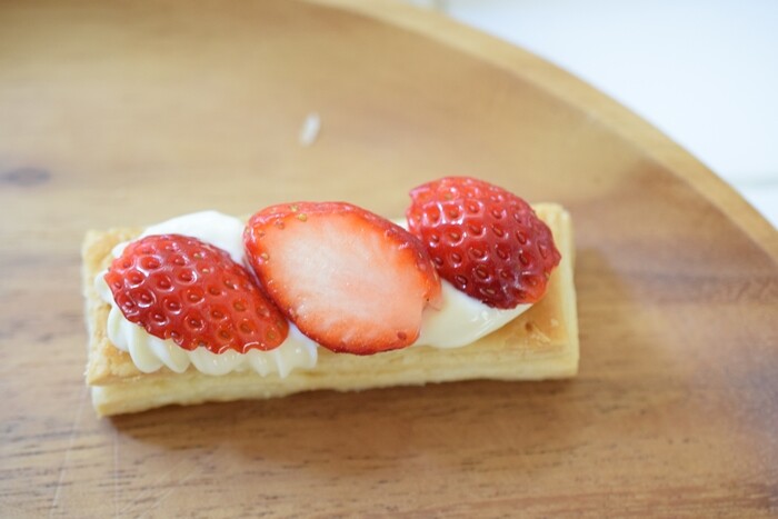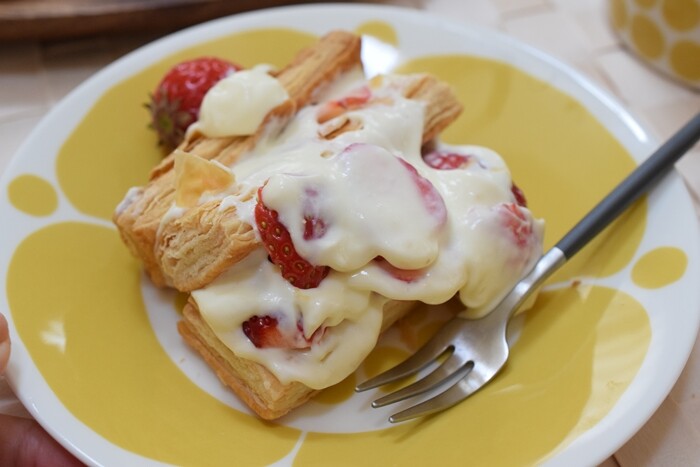 そのまま食べても美味しいのだけれど、何かお菓子を作りたいな~と思ったので、「冷凍パイシート」を使って、「苺のミルフィーユ」を作ってみました✨