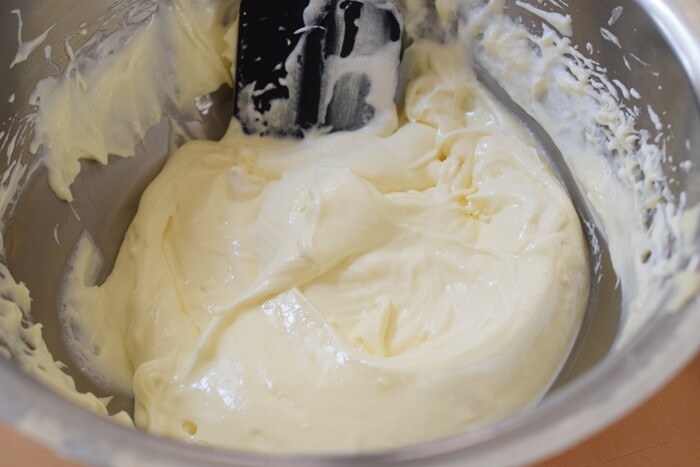 次に生クリームを泡立てて、冷やしたカスタードに混ぜます。