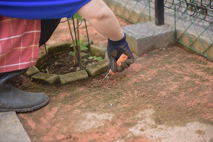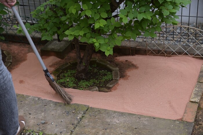 新たに固まる防草砂を撒いて、箒で平らに均します。