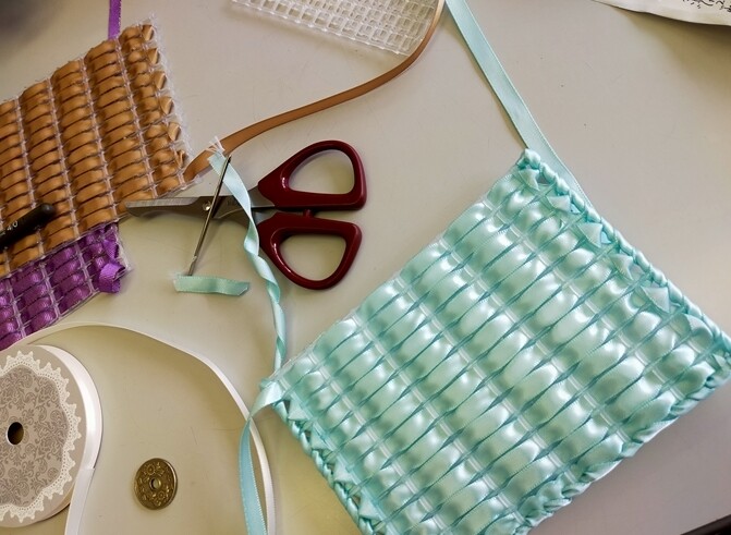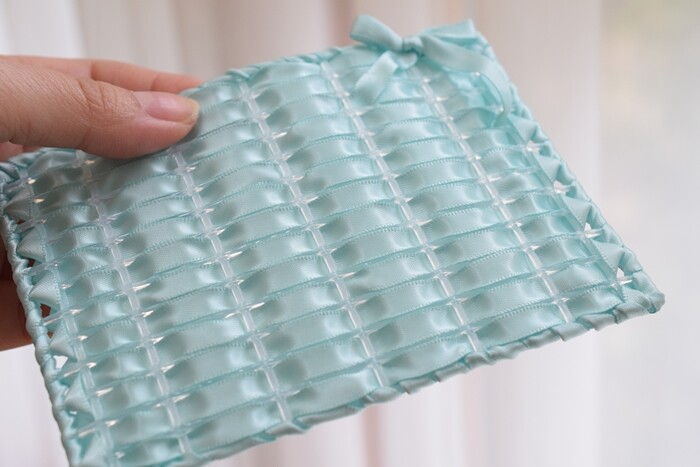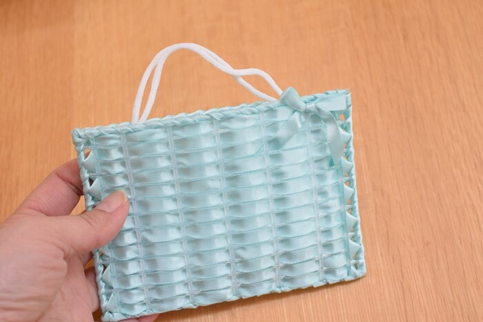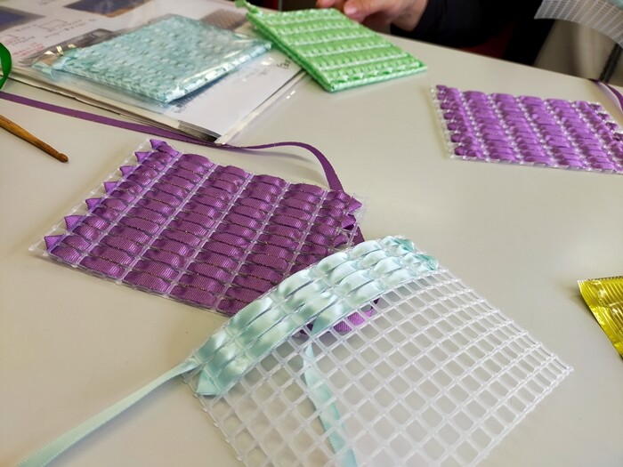 本来、これに固い「ハワイアンコード」という専用のコードを通すのだけれど、先生はサテンリボンを通す方法を教えてくださいました。バッグを作るならハワイアンコードが頑丈でよいけれど、軽いものを入れるだけならリボンで十分(*´∇`*)安いし柔らかくて軽くてよい💛これまた100均のラッピングコーナーにも売っていますが、ユザワヤのが6㎜幅×10m入りで100均より安かった(笑)ダイソーは5m…。