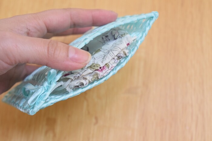 かぎ編み針で押してもよいけれど、何もなくても手で差し込めます。私は普通に指で通しました。