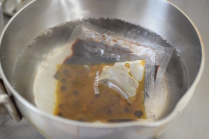 お湯で個包装ごと4分加熱(または袋から出して500Wの電子レンジで1分半加熱でもOK)。