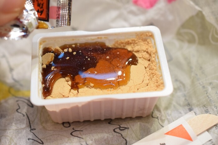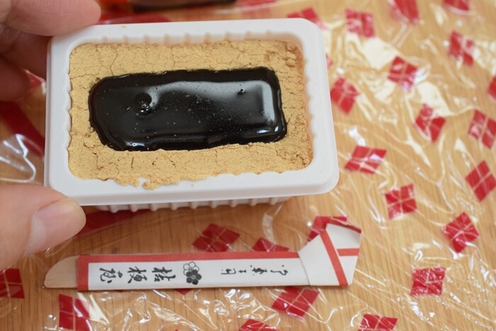 ▼こちらは山梨の桔梗屋の信玄餅。黒蜜がたっぷりで、真っ黒。