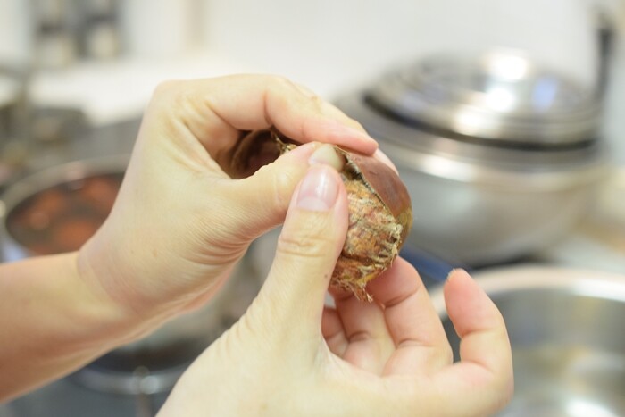 熱々の栗をトングで取り出し、包丁で下の部分をちょっと切ってから手で剥きました。