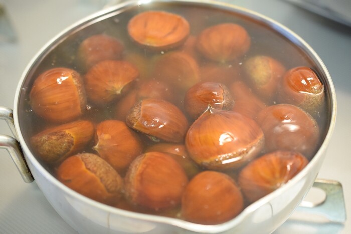 一晩冷凍したものに熱湯をかけ、5分ほど置くと手で鬼皮と渋皮がつるんと剥ける。 https://t.co/jZbjbHpNY1
