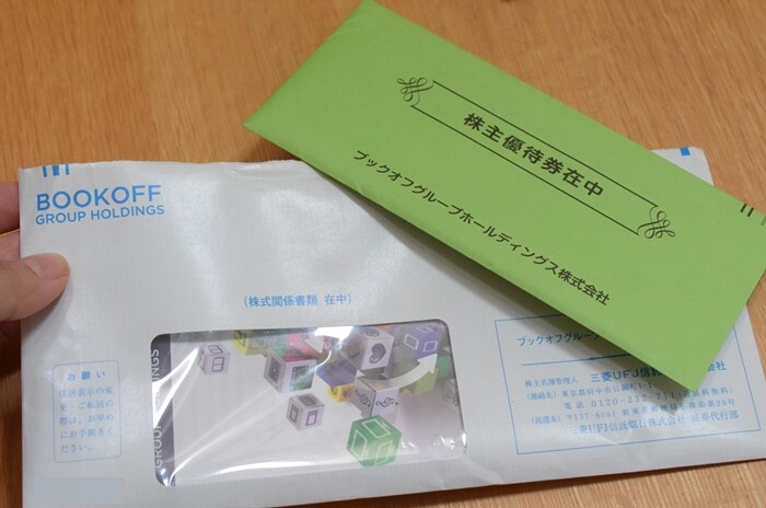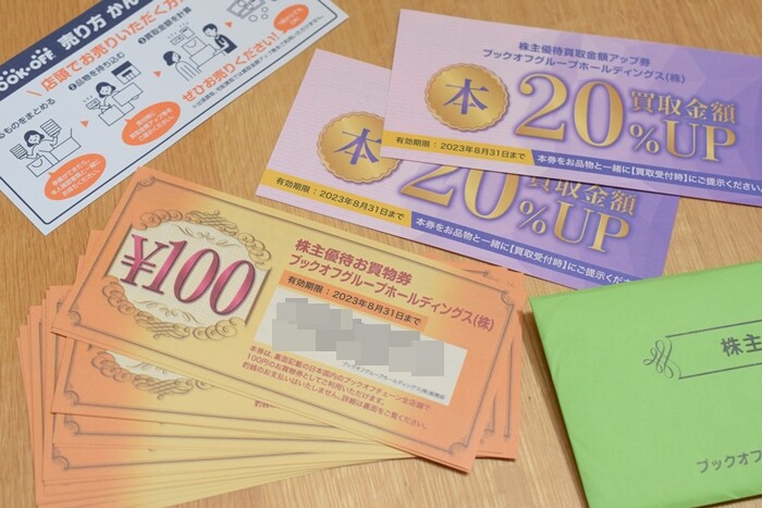 100株持っているのですが、ブックオフ株主優待買物券2000円分と、本の買取20%アップ券2枚が送られてきました♬