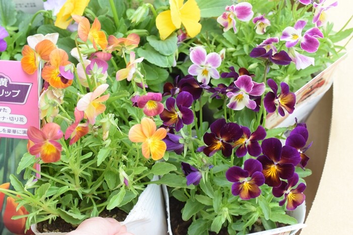 あっという間に植え付け完了~💛ビオラの後ろにチューリップの球根を埋めています。