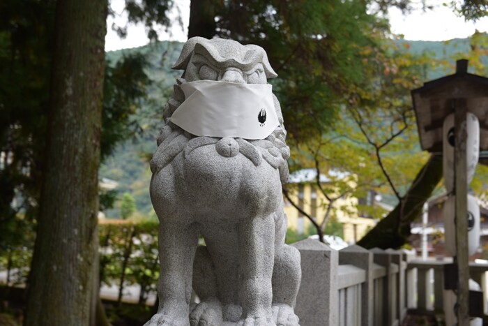 八咫烏(やたがらす)のマスクをつけた狛犬がお出迎えしてくれました♬