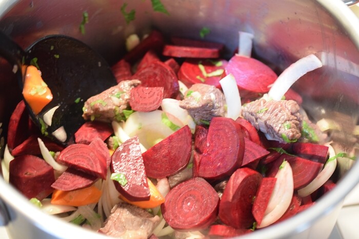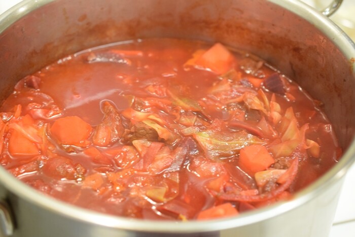 更に煮ると、ビーツから赤色が出てきて、スープが赤くなってきます!