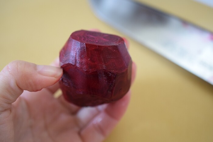 「ビーツ」は皮を剥いたら、こんな鮮やかな赤紫です。見た目はカブに似た感じです。