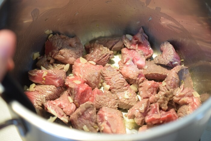 ②塩コショウした牛肉を投入。軽く焼き色を付ける。