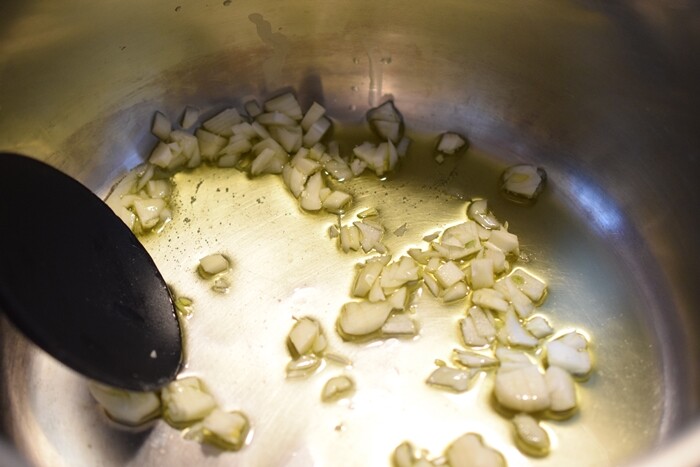 ①大きなポトフ鍋に、オリーブオイルを入れ、にんにく(みじん切り)を炒める。