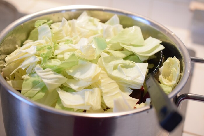 ⑥しばらく煮ると、キャベツから水分が出てきます。