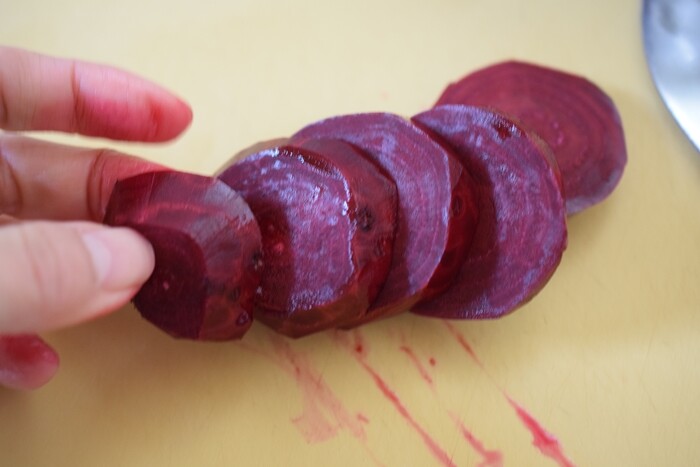 適当に切ってみました。私は初めて使う野菜なので、手もまな板も赤く染まって、ちょっとおっかなびっくり。