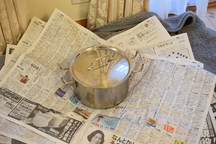 うちは「おでん」も「カレー」も「シチュー」もこうやって昼のうちに作って、新聞紙に包んでおくのよ~
