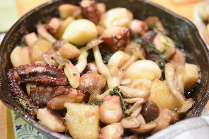 (スキレットにたっぷりのオリーブオイル、にんにく、タコ、シーフードミックス、しめじ、じゃがいも、ドライバジル、クレイジーソルトを入れて煮たてただけ~だけどめちゃくちゃ美味しい~)