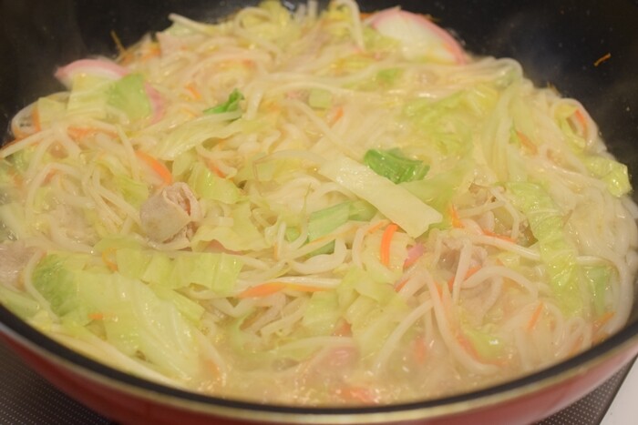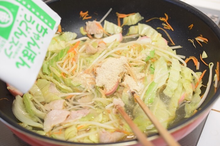 具材に火が通ったら、水300cc、ちゃんぽんうどんスープ1袋を投入。