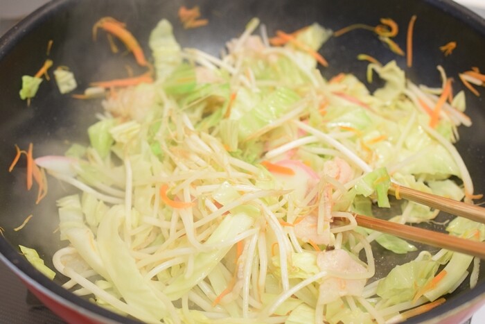 (今回は豚肉少々、キャベツ、ニンジン、もやし、かまぼこを炒めました。)