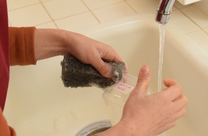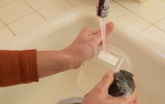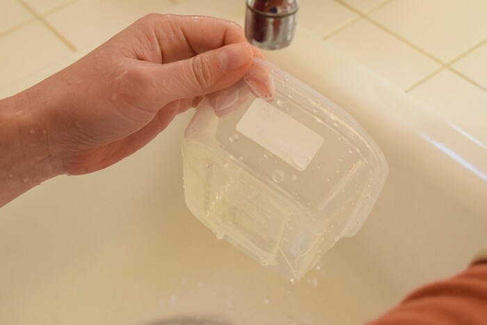 ガラスに貼ったものとプラスチックの容器に貼ったものの2つを入れて洗浄。