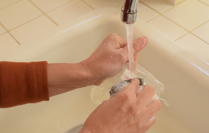 ③消したいときはお湯(40~45度目安)+中性洗剤をつけて洗うと書いた文字が消えます。