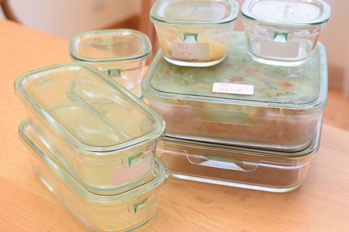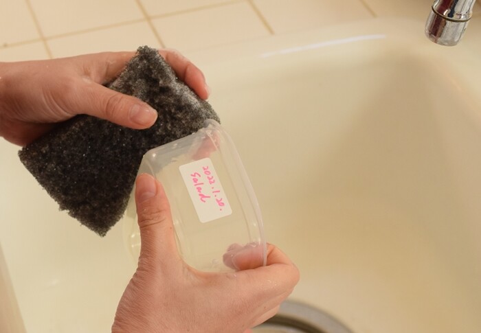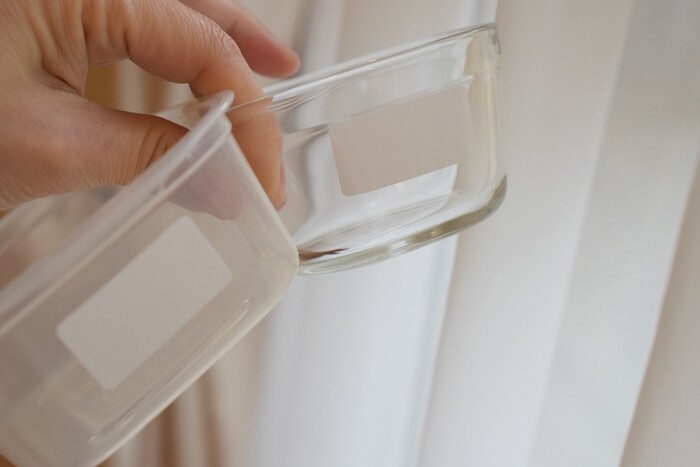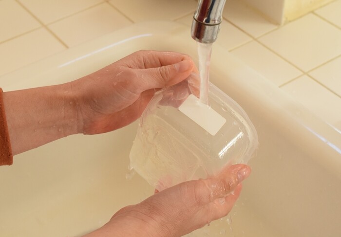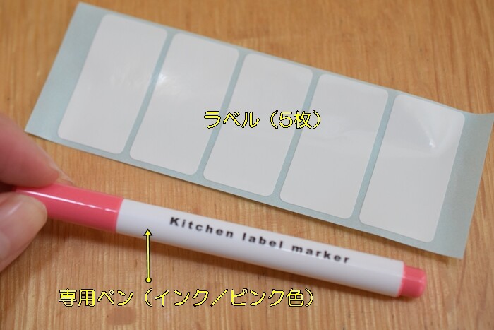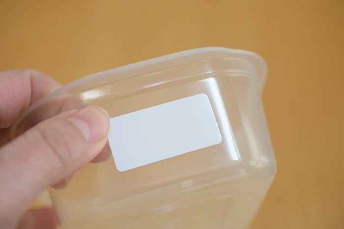 ①キッチンで使う保存容器(水洗いできるもの)にラベル(シール)を貼る。