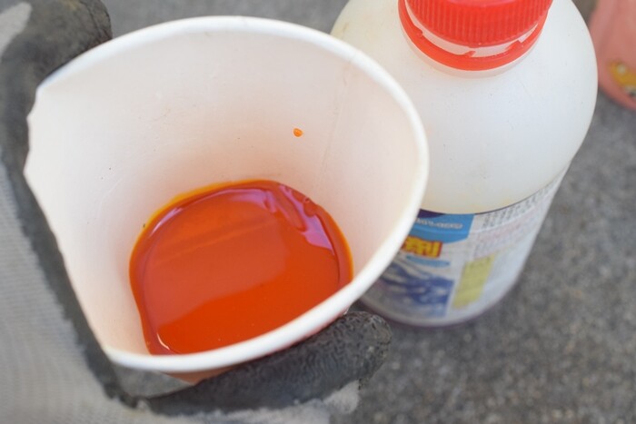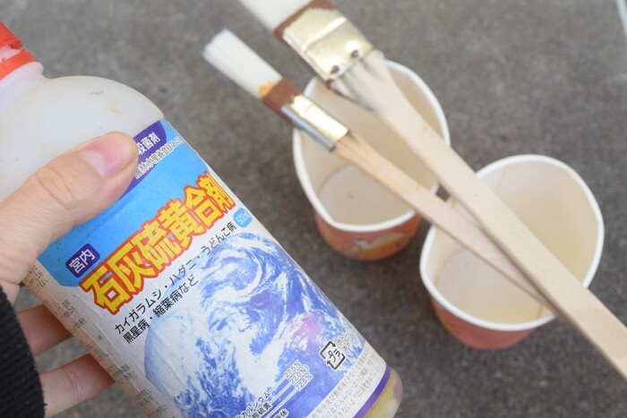 これは、虫は嫌いだろうなぁって思います。これを水で薄めて、ハケで塗ります。