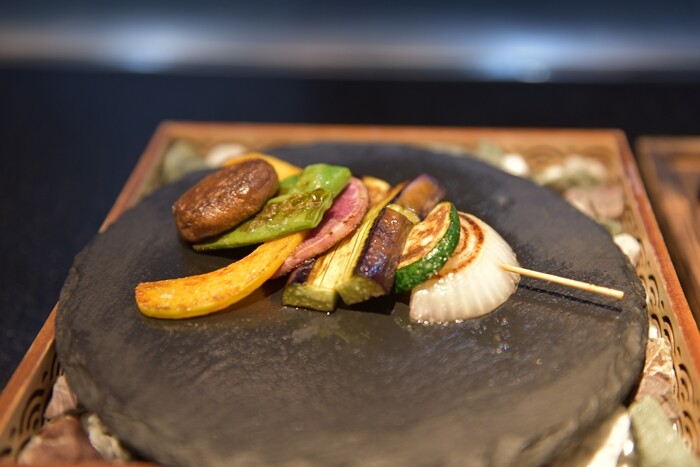 串に挿して、石のお皿に載せて出してくださいました♬盛り付けも素敵✨