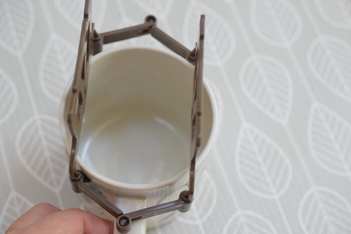 こうやってカップにかけて。伸縮パーツがカップの外に出るようにセットします。