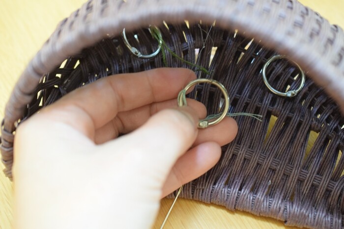 細いテグス糸をどう吊るすかが難しいのだけれど、外側から針で糸とテグスを通して、カゴの内側に出してカードリング(←家に余っていた)で留めました。