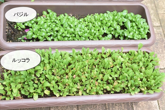 今年もプランターにバジルとルッコラを植えてみたのだけれど、袋の半量を適当に撒いただけでこれくらいに~(これから間引きます(^-^;)
