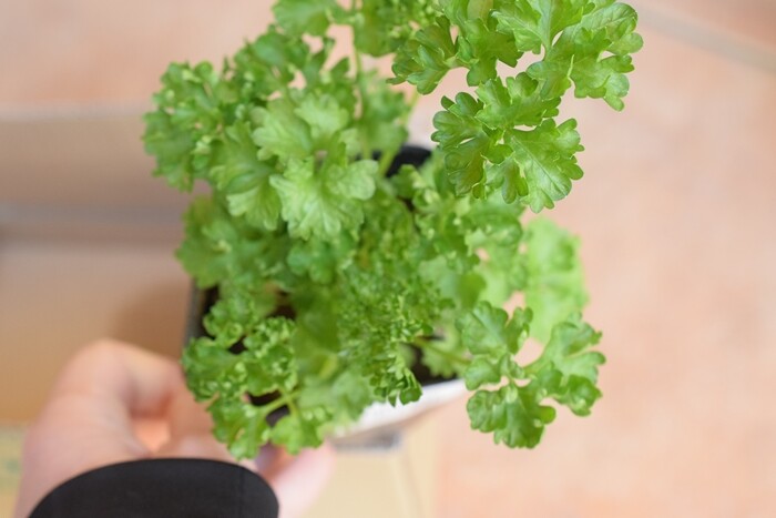 パセリは苗を100円で買ってきて、植木鉢に植え付けました(これはホームセンターで買いました)。