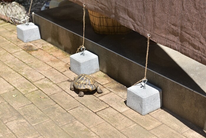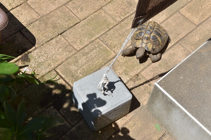 (夕方から朝までは家の中で寝かせています。でも日中は外に出たがるので、庭に放し飼いにしています。でもこの先、猛暑日の日は家の中で放し飼いの方が安心かなと思っています。)