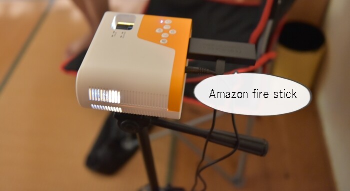 このプロジェクターの後ろにAmazon Fire TV Stickを挿して、Amazonプライムの映画を投影して観ました。
