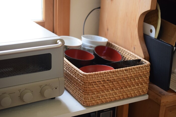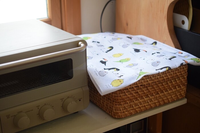 キッチンのお茶碗とお椀を入れているカゴにふわっと掛けることにしました♬