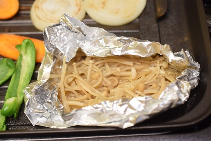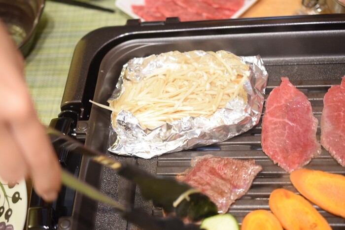 隙間があるとエノキタケが落ちちゃうということで、エノキだけアルミホイルの中で焼きました。バターと醤油を入れて。