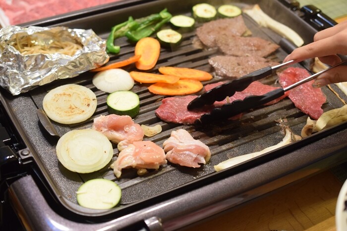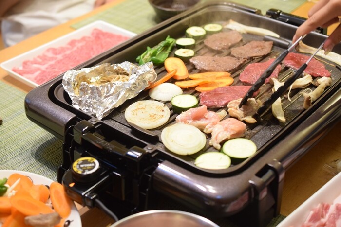 ホットプレートで焼肉すると煙と匂いが気になるけれど、それって油が過熱されることが原因なんですって。だから穴あきプレート(焼肉プレート)で油を落とすと煙や匂いがカットされてよいそうですよ。