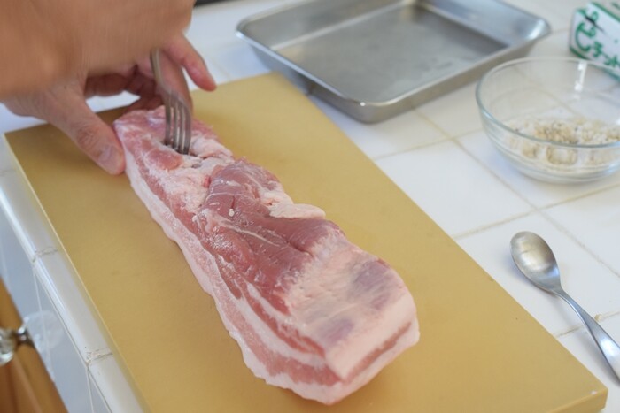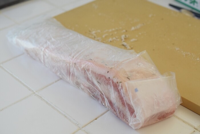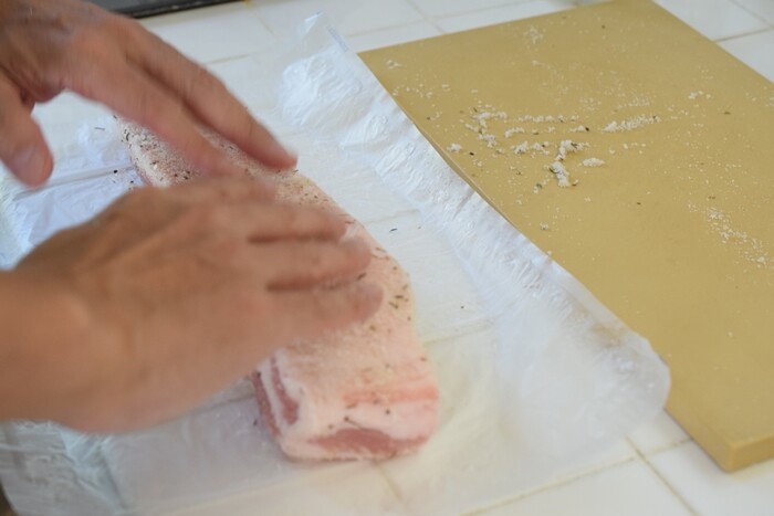 材料…豚バラ肉(塊)と塩(クレイジーソルト)だけ。