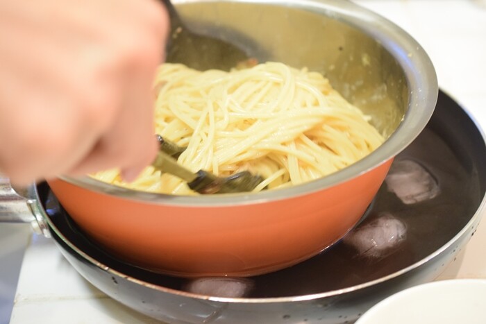 卵が固まらないように、冷やしながら混ぜていました。