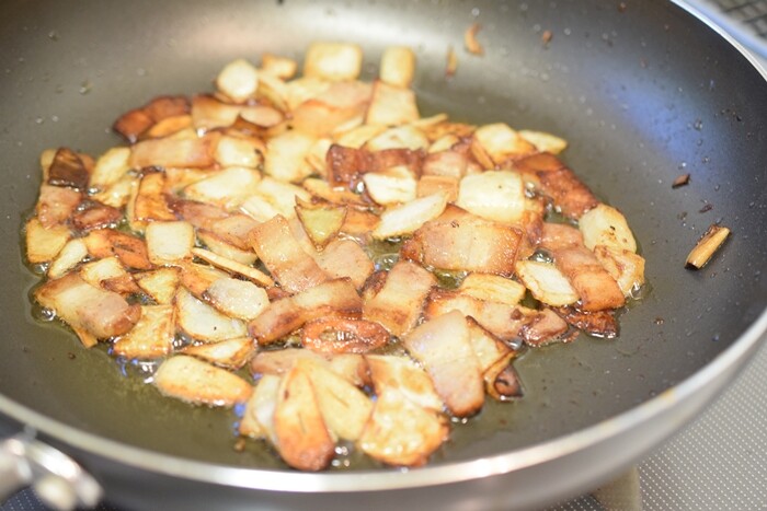 パスタは玉ねぎ、パンチェッタ、にんにくをじっくりと炒めてから~