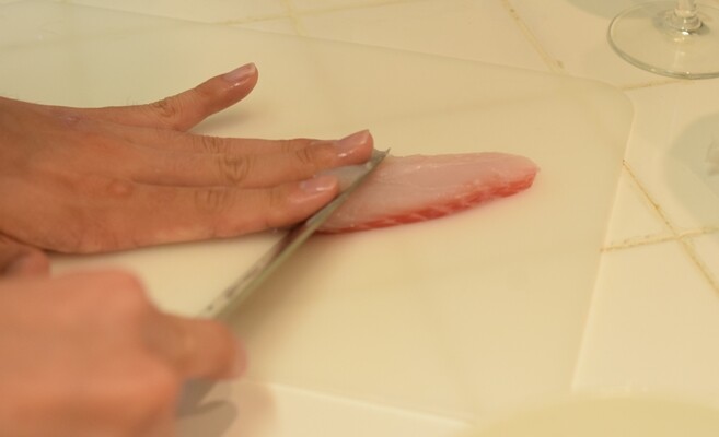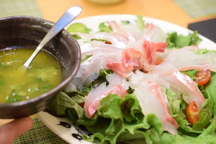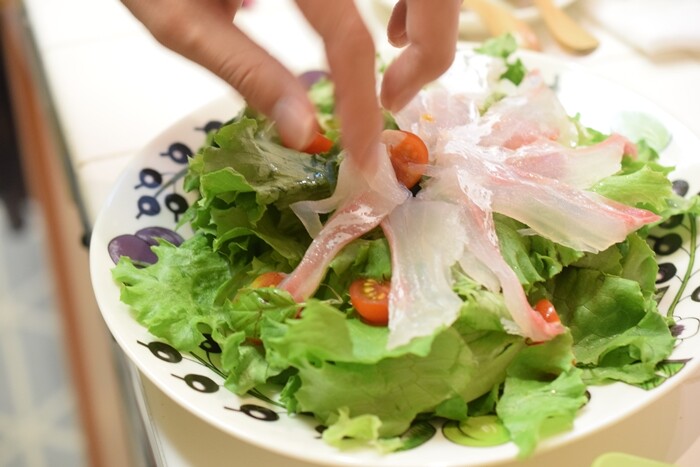 あとはサラダ。鯛の刺身を買ってきて薄く切って。