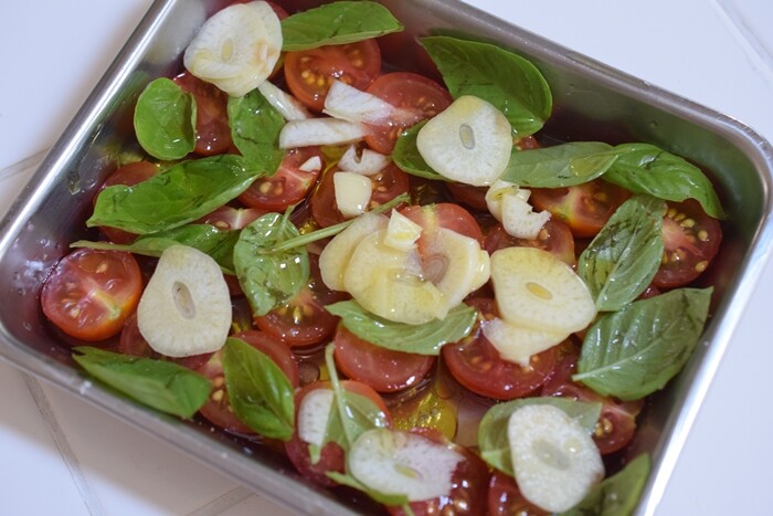 にんにく、バジル(庭のプランターから)、トマトをオリーブオイルと塩コショウでちょっと漬けて。
