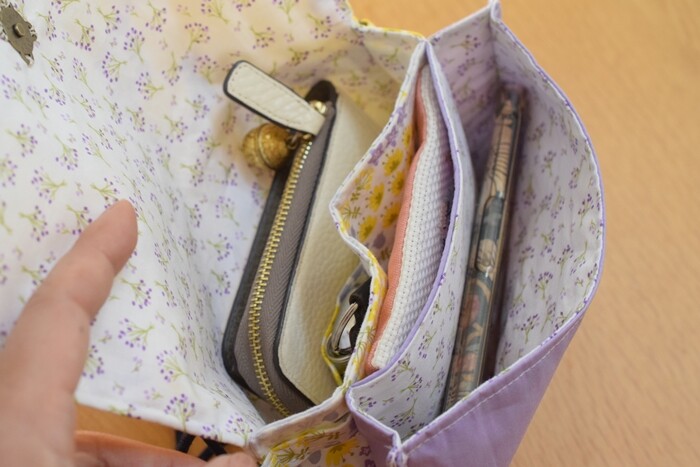 お財布、ハンカチティッシュ、携帯、鍵などを入れてちょっと買い物にも行ける感じ。