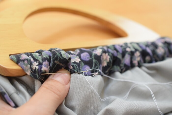 ギャザーを寄せて持ち手に通すのがまず厚手の生地なのでぎゅうぎゅうで、それをぎりぎり仕付け糸で縫いつけて。