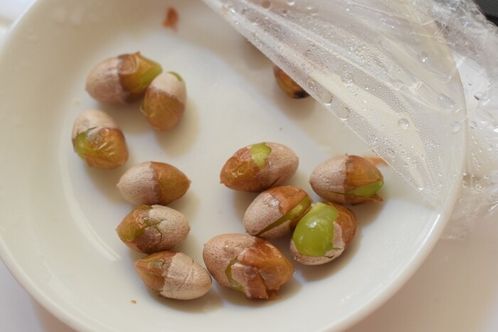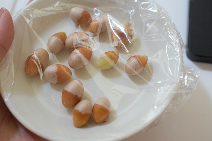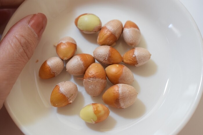 まだ薄皮がついたまま。何故か半分だけ色が違って、どんぐりみたい~。