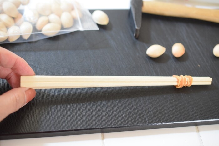 割り箸を割らずにそのまま2膳、先の方(細い方)を輪ゴムで止めて。