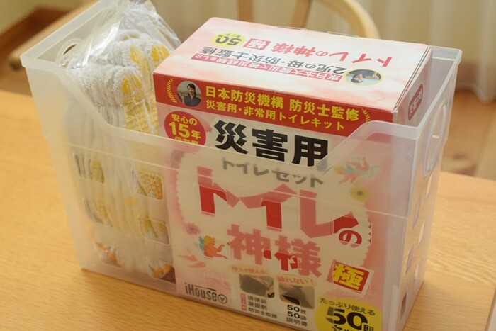 そこで、今あるタオル雑巾はこの年末の大掃除で使い切ることにして、ここは今度から「災害用トイレ」「軍手」を入れることに。(収納場所がなくて下の段に押し込んでいたので(^-^;)