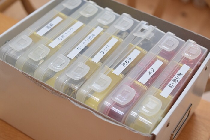 長年縦にして入れていたら、仕切りの底から細い釘などが移動するようになってしまったので…