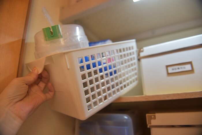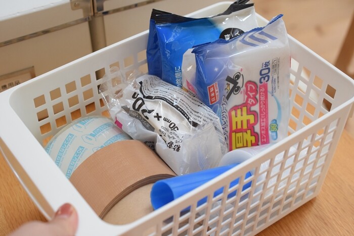 紙ごみを出すための梱包用フィルムやガムテープ、ビニールひも、ストックの掃除シートなどをカゴにまとめるだけでスッキリしますね。