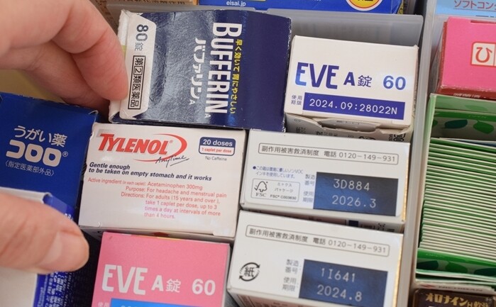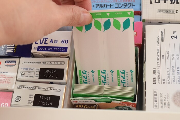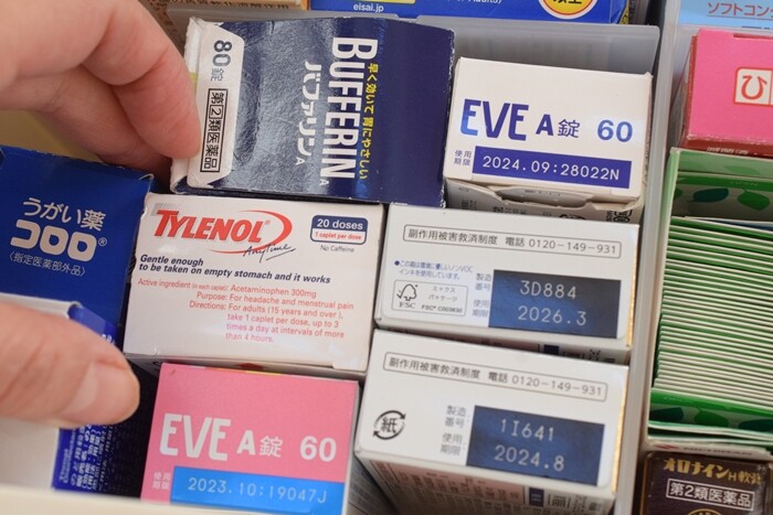 他にも頭痛薬(解熱剤)を一番よく使うので、バファリン、タイレノール、イブ、ロキソニン(右下の箱2つはロキソニン)は一番取り出しやすい手前に。