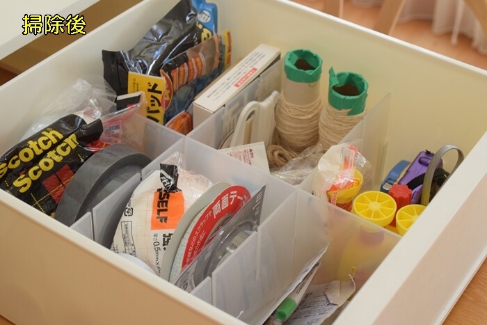 2つの引き出しのうち、1つにはテープやメジャー、紐、ボンドなどを収納しています。